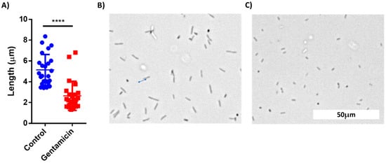 Comparison of cell length of treated and untreated E. coli cells after 60 min of incubation. (A) Cell length distribution between the control group and gentamicin-treated group. (B) A Brightfield microscopy photo of control cells. (C) A photo of gentamicin-treated cells. n = 25. Error bars indicate standard deviation (SD). **** P < 0.001.