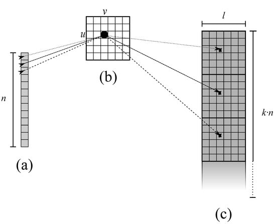 Figure 4. Graphical representation of configuration for patch centering on line 7 of Algorithm 2. (a) is the vector with mean values per patch, stored in a fast shared memory; (b) are threads , one per patch element; (c) is the strip of patches to be centered by subtracting corresponding mean values.