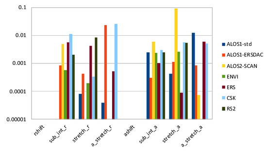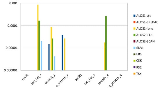Finally, Figure 8 presents the magnitude of relative error on the output least square fitting implemented by fitoffset.csh in the GMTSAR package, when cross-correlation is calculated using xcorr2-cl, with respect to the original xcorr software. Again, we eliminated the three datasets mentioned above because the output of cross-correlation was unusable. The only parameters estimated exactly are the range and azimuth shifts with pixel precision; all the others present errors with different magnitude per case, in some cases severely impacting on the coregistration.