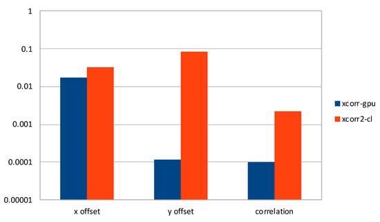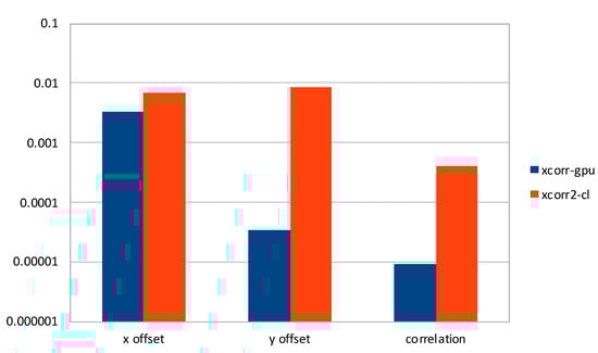 In Figure 6, we present a comparison of average on x and y offsets, and calculated correlation, considering all datasets except the three mentioned above, for xcorr-gpu and xcorr2-cl. We found that our software produces results with better accuracy of two orders of magnitude on two vectors. On the other hand, x offsets are accurate to three decimal digits for both pieces of software, with ours having a better accuracy on average. Figure 7 leads to similar reasoning, exacerbating the average errors for xcorr2-cl on y offsets.
