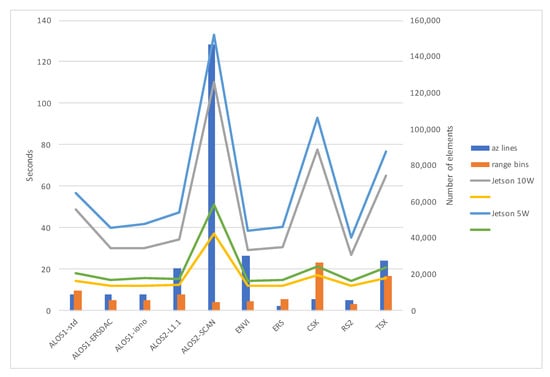 An interesting result is a visible link (see Figure 9) between the execution time (and its relative in Supervisor Mode) and the number of bins in the range direction. Even if most of the cross-correlations have the same parameters, and therefore the same work data size, those presenting longer-range lines seem to impact the performance of Jetson Nano indirectly. The number of lines in the azimuth direction does not seem to impact in the same way—the ALOS-2 ScanSAR dataset is processed on 4096 patches instead of 1000 in the other datasets. Analyzing the code execution through the NVIDIA profiler, we found out that memory allocation and copy between host and device introduce a consistent overhead and severely impact performance. From the test, this fact is particularly valid when extracting and aligning patches to build data structures described in Section 2.2. The reason resides in the Jetson Nano memory structure, where both the CPU and the GPU share SoC DRAM memory, each with different accessing and caching behaviors. Having our Jetson Nano CUDA Capability 5.3, pinned memory is not I/O coherent, and its CPU access time is higher because it is not cached on the CPU [35]. Since our code uses pinned memory for better performance on the other hardware configurations, we will consider future portability redesign to improve performance on Jetson boards with lower CUDA Capability.