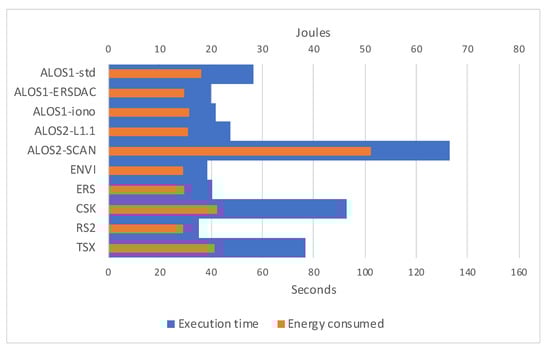 Graphical representation of the execution times for considered datasets on Jetson Nano hardware configuration set on 5-watt power mode, and relative joules of energy consumed.
