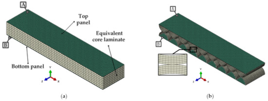In the equivalent model, the coupling between the equivalent core plate and the upper and lower panels adopts the classic laminate theory. The faceplate and the core layer both adopt C3D8R (eight-node linear hexahedral element) three-dimensional stress solid element, and the core layer is given equivalent mechanical parameters and material properties. The finite element analysis model is shown in