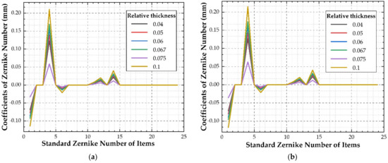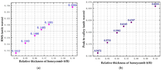 Table 5). The transmission optical path difference wave aberration values (PV, RMS) of the window glass caused by honeycomb flexible support structure with different relative thicknesses are calculated, as shown in