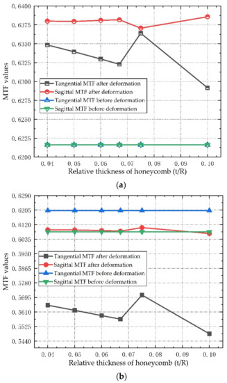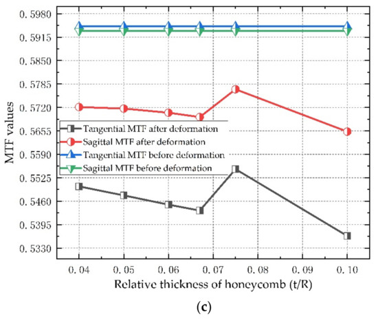 Figure 11, after the introduction of deformed window glass, the MTF values of the three fields of view slightly increase or decrease, but the range of change is very small, and the maximum decrease of MTF is less than 0.073, which meets the design requirements of the optical system. It is also noted that with a decrease in the relative thickness, the change of MTF value decreases gradually, indicating that the honeycomb flexible support structure has a good effect on the thermal stress release of window glass. According to the analysis of optical performance, the double-layer semicircular honeycomb flexible support structure has little influence on the deformation of the window glass, which can be approximated as a positive lens with very small focal power outside the cabin. After introducing it into the optical system, it causes the aberration of some fields of view to increase, but at the same time it may also compensate the aberration in some directions of other fields of view, so that the MTF value shows a slight change trend of increasing and decreasing in different fields of view after the introduction of deformed window glass. However, due to the small change value, the image quality of the optical system does not change significantly after focusing, which meets the image quality requirements of the remote sensor.