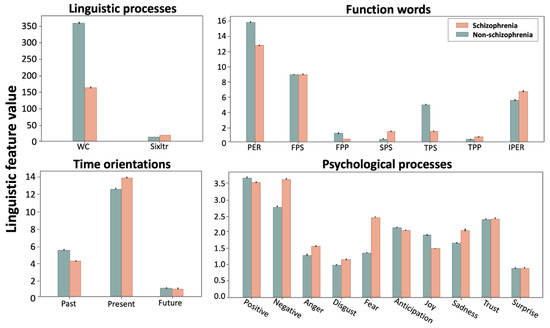 Comparison of the linguistic features between the schizophrenia and the non-schizophrenia (control) groups. Bars and error bars correspond, respectively, to averages and standard deviations across the linguistic values for each linguistic feature. WC = word count; Sixltr = words longer than six letters; PER = personal pronouns; FPS = first person singular; FPP = first person plural; SPS = second person singular; TPS = third person singular; TPP = third person plural; IPER = impersonal pronouns.