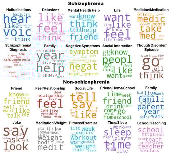 Word cloud visualization based on the distribution of words for each topic discovered from the schizophrenia and non-schizophrenia (control) groups.