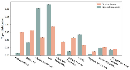 Comparison of the topic distributions between the schizophrenia and the non-schizophrenia (control) groups within topics identified from the schizophrenia posts. Bars and error bars correspond, respectively, to averages and standard deviations across the topic distribution values. All pairwise comparisons show significant differences in topic distributions between the two groups. Schizophrenia has statistically higher topic distributions in “hallucinations”, “delusions”, “negative symptoms”, and “medicine and medication” (all p < 0.001) and lower values in topics of “life” and “family” (all p < 0.001), compared to the control group.