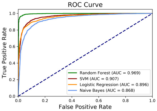The performance of each algorithm is listed in Table 4. Among algorithms tested, the random forest algorithm achieved the highest accuracy of 96% (recall = 94%, precision = 98%, F1-score = 96%), which exceeds all other accuracy results (86–91%) with the other three algorithms. Similarly, the random forest model performed best with the area under the receiver operating characteristic (ROC) curve (AUC) of 0.97, whereas the other three models provided lower performance with an AUC range of 0.87–0.91 (Table 4; Figure 4). Additional details on the algorithm performance based on the input features are provided in Supplementary Table S2.