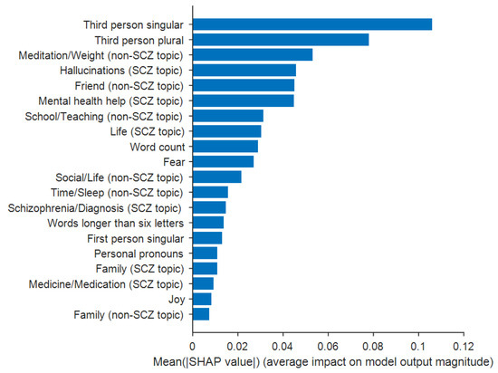 The random forest model was chosen for further analysis (i.e., feature importance) given that it had the greatest classification accuracy. For each feature, the SHAP feature importance quantified as the mean absolute Shapley value is shown in Figure 5. The feature of “third person singular pronouns” was the most important feature and the feature of “family” from the non-schizophrenia topic was the least important feature. Additional details on the feature importance are provided in Supplementary Table S3.