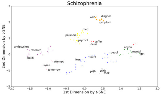 We performed unsupervised clustering to test whether there were coherent semantic groups of words in schizophrenia on the basis of the features used for classification. To do this, we chose to use the term frequency–inverse document frequency (TF-IDF) to represent posts as feature vectors, as they are amongst the most widely used features in computational linguistic studies [7,9,15]. TF-IDF measures how important a particular word is with respect to a document and the entire corpus. Using the TF-IDF vectorizer in the scikit-learn library, each post in the schizophrenia subreddit was represented as a feature vector of normalized TF-IDF scores of the top 1024 unigrams (i.e., a sequence of one word in a sentence). Posts from the control subreddits were processed through the same processing pipeline. Among the classifiers tested, we chose logistic regression due to its relative simplicity and ability to capture features important for classification. Using these features (26,312 × 1024 matrix), we first trained an L1-penalized logistic regression with the regularization strength parameter (C = 0.1) to perform a binary classification (schizophrenia versus control groups) from which the 100 most predictive features associated with the top positive regression weights were selected. Second, we represented each word using the document vector, which is thought to be a semantic representation of the word [15]. Third, the feature set was reduced to five principal component analysis (PCA) components, which were successfully used to reduce the number of features in the data [9,15]. PCA was chosen because it removes correlated features, improves the performance of machine learning algorithms, and helps in overcoming the overfitting issues [31,36]. Fourth, we reduced the dimensionality of the semantic space to two dimensions using t-distributed stochastic neighbor embedding (t-SNE) with a perplexity of 7 for choosing the optimal number of clusters as well as ease of visualization [37]. t-SNE can capture nonlinear structures in the data and preserve the local and global structure of the data [37]. Dimensionality reduction using t-SNE paved the way for subsequent clustering analysis. Finally, we applied an unsupervised learning technique of DBSCAN to the most predictive words using an epsilon of 0.3 and minimum samples of three [15,38] in order to identify coherent semantic groups of words in schizophrenia. The DBSCAN clustering algorithm was chosen because it finds clusters by identifying dense groups of points in the data, making few assumptions about the distributions of these groups and no assumptions about the number of clusters [38]. Out of 20 t-SNE iterations, we retained eight semantic clusters as it provided the most semantic characterization of words in schizophrenia. We confirmed the validity of cluster annotation through post review.