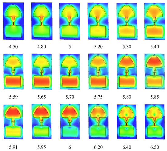 Current distributions on the proposed microstrip array as a function of frequency (in GHz).