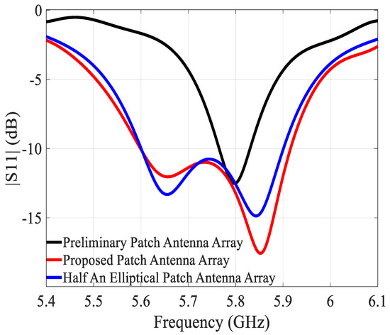 Simulated |S11|of the preliminary array, proposed array with rectangular bottom patch, and proposed array with two half elliptical patches.