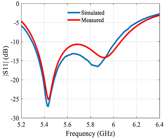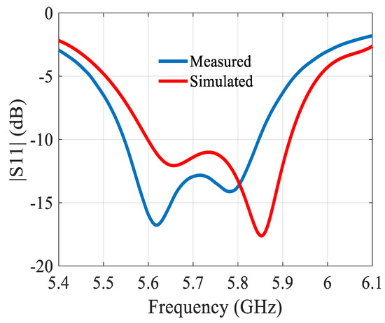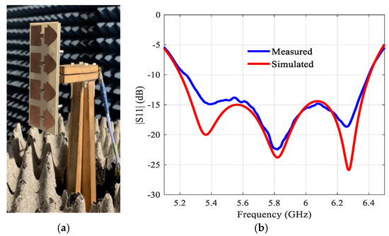 The antenna array was prototyped on a 1.94λ × λ ground plane. The fabricated prototype is Figure 17a. The return loss was measured and is compared with the simulation in Figure 17b. The agreement is quite good. The simulated bandwidth (|S11| ˂ 10 dB) is 5.2 to 6.4 GHz (1.2 GHz).