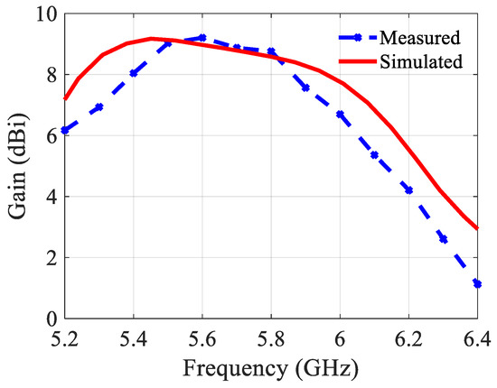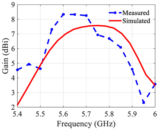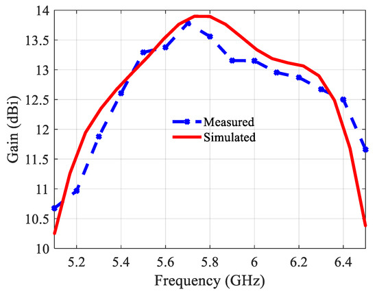 Figure 18 depicts the far-field radiation patterns of the antenna array in the E- and H-plane at 5.8 GHz. The measured results agree well with the simulated results. The proposed antenna has a 3-dB beamwidth of ~43° and 26° in the E- and H-plane at 5.8 GHz, respectively. The variation in the gain, both simulated and measured, over the matching bandwidth, as shown in Figure 19, is about 1 dB, which is very satisfactory. The maximum gain in simulation is 13.9 dBi at 5.8 GHz. Aperture efficiency and radiation efficiency are 100% and 96% at 5.8 GHz, respectively. It has to be emphasized that losses were considered in the simulations.