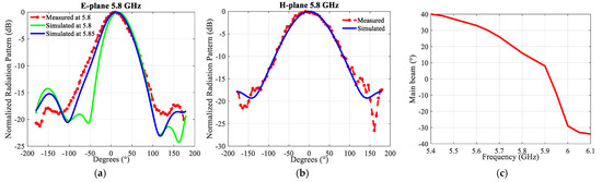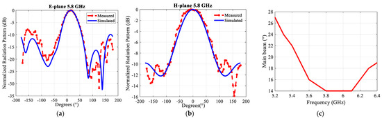 As shown in Figure 11, the measured and simulated radiation patterns are in a good agreement. There are different values in the backside direction (+180/−180) due to the measurement equipment. The antenna has to be rotated on the setup depending on the measurement plane (E or H). As a consequence, the orientation of the feeding cable is not the same for both measurement topologies, resulting in different levels in the backside direction. Figure 11c shows the main beam’s direction in the E-plane changing across the bandwidth. The variation is much less than in case of the structure without an air layer, and from 5.8 GHz up to 6.1 GHz this beam direction is quasi constant at ca. 14°.