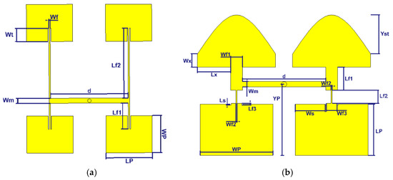 Configuration of the (a) conventional 2 × 2 antenna array (b) proposed 2 × 2 antenna array.