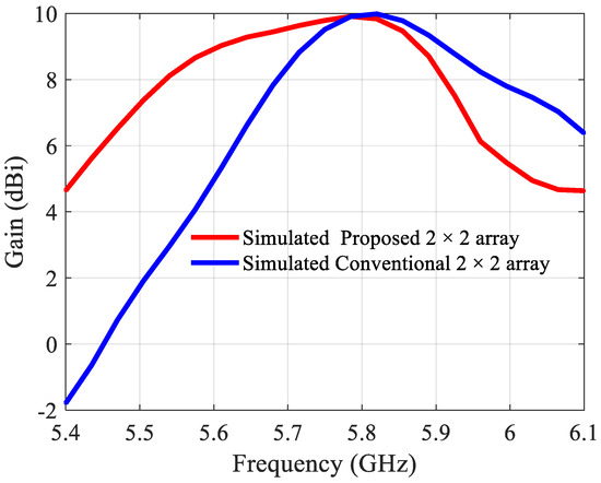 Simulated gain of the conventional and proposed 2 × 2 antenna array.