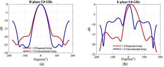 Simulated radiation patterns in (a) the H-plane, (b) the E-plane of the 2 × 2 conventional and proposed arrays at 5.8 GHz.
