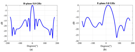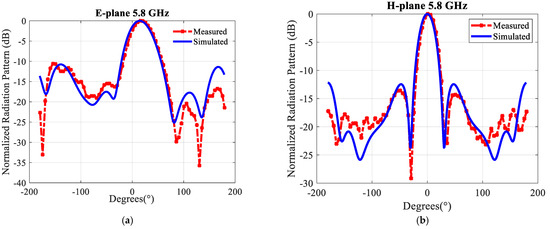 Taking into account the shift in|S11| in Figure 7a the simulated radiation pattern in the E-plane at 5.85 GHz is also depicted. It agrees extremely well with the radiation pattern measured at 5.8 GHz. The radiation patterns are compared at the frequency of resonance, which is slightly different in simulations and measurements. The antenna has −3 dB beamwidths of ~57° and ~86° in the E- and H-plane at 5.8 GHz, respectively. The differences between simulated and measured values are small enough so that they can be entirely attributed to the tolerances on the permittivity of the substrate, and the dimensional precision of the fabricated antenna.