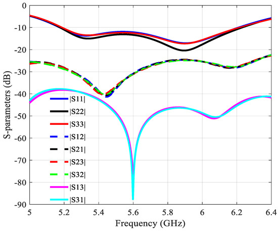 The simulated S-parameters of the array are shown in Figure 21. The simulated −10 dB bandwidth is from 5.15 to 6.18 GHz, or about 17% for a center frequency of 5.8 GHz. A low mutual coupling between the three ports is observed, below −25 dB in the whole operation band.