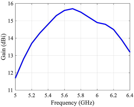 The simulated |S11| of the conventional and the miniaturized 2 × 2 array are shown in Figure 13. The −10 dB bandwidths are 70 MHz (5.75–5.82 GHz) and 340 MHz (5.56–5.90 GHz), respectively, which is similar as for the 2 × 1 arrays. The gains are both 9.9 dBi at 5.8 GHz (Figure 14), the aperture efficiencies at 5.8 GHz are 70% and 97%, and the radiation efficiencies at 5.8 GHz 80% and 87%, respectively.