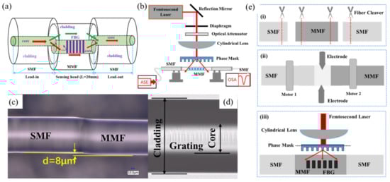 (a) The schematic diagram of the hybrid structure. (b) The schematic diagram of grating fabrication system with femtosecond laser phase mask method. (c) The optical image of the fusion region between SMF and MMF. (d) The optical image of the grating modulation region. (e) The schematic diagram of the fabrication process of the sensor.