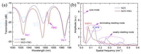 (a) The transmission spectrum of the proposed sensor (b) The spatial frequency spectrum of the single MZI without FBG and hybrid structure.