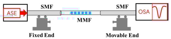 Figure 1a shows the schematic diagram of the hybrid structure. The sensor consists of an MZI and an FBG. The MZI is formed by offset splicing a section of MMF (MMF50/125, Nufern) between two SMFs (SMF-28e, Corning) as displayed in our previous work [8]. The core and cladding diameters of the MMF are 50 μm and 125 μm, respectively. The MMF length is set as about 20 mm and the MZI is fabricated using only a fiber cleaver (CT 30, Fujikura) and a fusion splicer (FSM 80 s, Fujikura). Also, the core offset welding is realized by using the “Attenuation Mode (AM)” on the fusion splicer menu. As shown in Figure 1a, the light in the lead-in SMF is divided into two parts, one path of light is transmitted in the core of MMF, the other path is transmitted in the cladding of MMF. At the right fusion offset joint, the light transmitted in the cladding of MMF will be recoupled into the core of SMF. The two paths of light will produce a phase difference in the core of the lead-out fiber due to the difference in the effective refractive index between the core and cladding of MMF and form an interference pattern in the transmission spectrum. FBG induced by femtosecond laser will reflect part of the light transmitted in the core of MMF into the collapsed area at the fusion joint and the transmitted light through the grating will couple with the light transmitted in the cladding of MMF. In addition, the induced FBG changes the refractive indices of the core of MMF, which results in the phase change of MZI, showing a change in transmission intensity of dips. The MZI based on SMS structure is a classical configuration and simple to fabricate. Here, we have used the lateral offset fusion method to increase the excitation of the cladding mode in the MMF, and an offset of about 8 μm between the core of SMF and MMF is achieved, as shown in Figure 1c. The FBG is written by using femtosecond laser phase mask technology, as shown in Figure 1b. The femtosecond laser pulses are generated by an 800 nm sapphire amplifier (Spectra-physics) with a duration of 120 fs and a repetition rate of 1 kHz. The light beam is focused through a cylindrical lens with a focal length of 50 mm into the phase mask and the light beam diameter and energy flux are controlled by a diaphragm an optical attenuator, respectively. The phase mask (Ibsen Photonics) is optimized for an 800 nm femtosecond laser and designed with a period of 2142 nm and zero-order diffraction of below 4%, which can produce 2nd-order Bragg grating at 1550 nm band. The FBG is written in the core of MMF with single pulse energy of 0.6 mJ and an exposure time of about 30 s. The fabrication process of the sensor is described as shown in Figure 1e. The steps are as follows: (i) use fiber cutting plier to remove the fiber coating layer of the optical fibers and clean their fiber surfaces with alcohol, and then use a fiber cleaver to cut a section of MMF with a length of about 20 mm as well as obtain the fiber ends of SMF and MMF; (ii) select the welding mode and use a fusion splicer to discharge and splice SMF and MMF, forming an MZI with SMS structure; (iii) fix the MZI device on the fiber clamp and adjust the laser parameters of phase mask fabrication, and finally make an FBG in the MMF core. Figure 2a shows the transmission spectrum of the single MZI without FBG and the hybrid structure. It can be found that the proposed hybrid sensor has shown deeper dips than the single MZI without FBG and high fringe visibility of up to 15 dB is achieved. This phenomenon could be due to the refractive index change in the core of MMF induced by the introduction of FBG. In addition, broadband amplified spontaneous emission (ASE) source with a wavelength range of 1528–1602 nm and an optical spectrum analyzer (OSA, Agilent 86142B) with a wavelength range 600–1700 nm) and a wavelength resolution of 0.01 nm are connected to record the transmission spectrum as displayed in the Figure 1b.