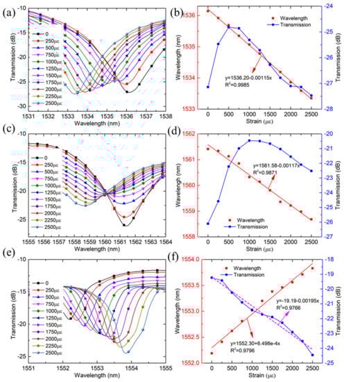 During the strain test, the sensor is fixed on two micro-displacement platforms (GCM-127201AM, DaHeng Optics) as shown in Figure 3. The original length of the two platforms is set as 200 mm, and each time the movable displacement platform is stretched forward with a step of 50 μm and the corresponding strain is 250 με. The measurement strain range is set as 0~2500 με. To compare the strain and temperature characteristics of FBG peak and the wavelengths of MZI, two dips of MZI at 1536 nm and 1561 nm and FBG wavelength at 1552 nm are selected, as displayed in Figure 4. Figure 4 shows the transmission spectrum change for three wavelengths as the strain increases. It is found that the dips of MZI have shown a blue-shift, but the FBG peak has a red-shift as the strain increases. Dip 1 and dip 2 have a wavelength variation of 2.79 nm and 2.73 nm in the range of 0~2500 με, respectively, as shown in Figure 4b,d. A strain sensitivity of −1.15 pm/με and −1.17 pm/με for the dip 1 and dip 2 is achieved by linear fitting, respectively. The fitting results have shown a perfect linear relationship between the strain and wavelength shift, and a high goodness of over 0.9985 are obtained. Meanwhile, the FBG peak has a red-shift with a wavelength change of 1.64 nm as the strain increases. The strain sensitivity of 0.6498 pm/με with a goodness of fit of 0.9796 is achieved by linear fitting, as shown in Figure 4f. In addition, the transmission loss of the two dips of MZI shows a tendency to increase before decreasing as displayed in Figure 4b,d. However, the FBG peak has shown a trend of linear reduction as the strain increases, and a transmission loss sensitivity of −0.00195 dB/με is achieved, as displayed in Figure 4f. The transmission loss change of MZI is closely related to the splitting ratio of light, difference of the refractive index change, and the length of MZI [30]. When a strain is applied, the strain-induced changes in the difference of the effective indices are dominant, resulting in the transmission loss change of dip1 and dip2 is significant and those changes are nonlinearity.