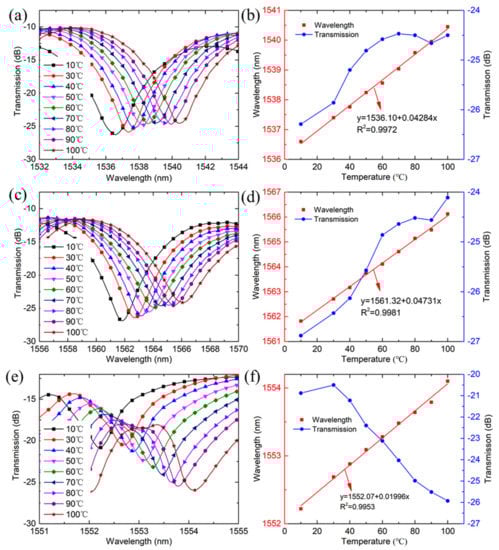 During the temperature test, the sensor is fixed on an electric heating plate with a resolution of 1 °C. As the temperature increases from room temperature to 100 °C, the three wavelengths present red-shifts, and a wavelength shift of 3.85 nm, 4.3 nm, and 1.88 nm is achieved for the dip1, dip2, and FBG peak, respectively, as shown in Figure 5a,c,e. The wavelengths all display linear responses to the temperatures and a temperature sensitivity of 42.84 pm/°C, 47.31 pm/°C and 19.96 pm/°C for the dip1, dip2 and FBG peak is achieved in the range of 10–100 °C, as shown in Figure 5b,d,f. Moreover, the transmission loss of the dips of MZI and FBG peak have shown an opposite trend. The transmission of dip 1 and dip 2 increases at an average rate of 0.0199 dB/°C and 0.0308 dB/°C, respectively, while the FBG decreases at a rate of 0.0811 dB/°C as the temperature increases.