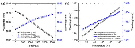 In addition, the wavelength hysteresis of the sensor induced by strain and temperature are investigated as shown in Figure 6. The strain measurement is conducted as the strain increases from 0 to 2500 με and decreases from 2500 με to 0, and it can be found that the max wavelength hysteresis error of the dip1 and FBG peak is about 0.12 nm and 0.11 nm, respectively, as shown in Figure 6a. A wavelength of hysteresis of 0.11 nm and 0.1 nm for the dip1 and FBG peak, respectively, is observed as shown in Figure 6b, as the temperature increases from 10 °C to 100 °C and decreases from 100 °C to 10 °C. From the investigation, it can be found that the dips of MZI and FBG peaks have similar wavelength hysteresis.