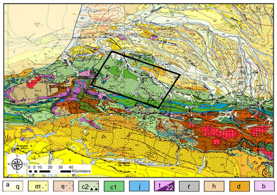 Regional geology depicting the predominantly cretaceous formations in the main area of the Maupasacq experiment. a: Quaternary alluvial deposits; q: Plio-Quaternary colluvium; m: Miocene; e: Eocene; c2: Upper Cretaceous; c1: Early Cretaceous; j: Jurassic; t: Triassic; 22: Ophites; r: Permian; h: Carboniferous; d: Devonian; b: Cambrian–Ordovician. Adapted from [21].