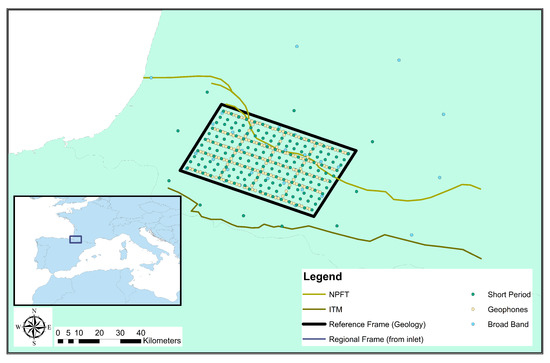 An exquisite laboratory to explore the answer to this question is the recent Maupasacq experiment, a dense network of 441 three-component seismic instruments placed on a rectangular grid in the French Pyrenees and dedicated to passive seismology research. The array covered about 1500 km2 with a minimum interstation distance of and is surrounded by two rings of 24 broadband and short-period seismometers in total, located between and km from the center of the network, approximately. While the experiment attempts to shed light on the regional crustal structure of the Mauléon Basin in the Western Pyrenees with a large-N array, it is designed such that it allows inferring about the individual and joint performance of different passive seismic methods, such as local earthquake tomography (LET), ambient noise tomography (ANT) and, intrinsically, HVSR. Additionally, three different instrument types were employed for the experiment in order to establish the ideal use cases for each type. The survey’s acquisition layout was designed to maximise the information that could be obtained from LET and ANT with a target depth in the order of several kilometres [17]. These depths are beyond the capabilities of HVSR inversions in our experimental setup. Nevertheless, the inversion of dispersion curves experiences problems when a suboptimal initial range of near surface velocities causes low crustal velocities, and LET tends to overestimate near surface velocities, which may reduce overall resolution and accuracy. For both methods, HVSR can supply constrains on the near surface model parameters that allow distinguishing otherwise equally valid models and, therefore, complementing LET and ANT. Therefore, HVSR inversion results can potentially refine crustal velocities even though HVSR data cannot be used to sense such depths in our experiment. In fact, HVSR is already commonly and successfully used in joint inversions with dispersion curve (DC) data for shallow subsurface characterisations [18,19,20], where both methods effectively compensate for each others’ non uniqueness.