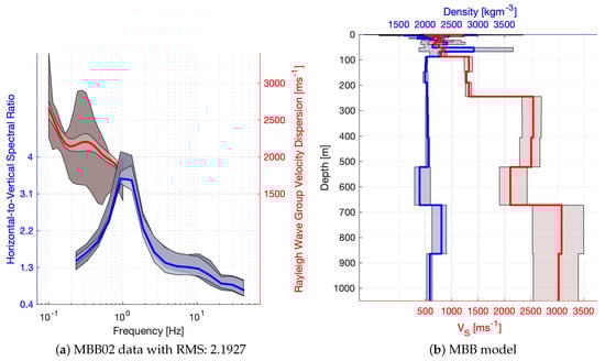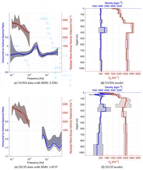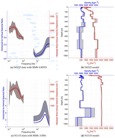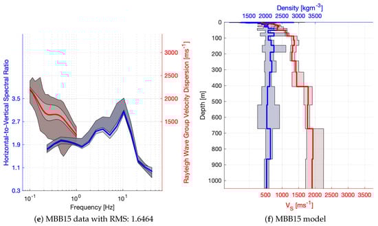 Most of the sites achieved a moderately good misfit with (see Figure 7a), with a better performance for short period and broad band sites. The misfit cut value of 14 was chosen manually by visual inspection of the data fit and considering that a significant amount of models can be interpreted for the better performing instrument types. The tested models are evaluated for the weighted mean and standard deviation of and density according to each models’ log-likelihood. Examples of the processed and modelled HVSR and dispersion curves are plotted in the left hand panels of Figure 3 and Figure 4. Dark shades correspond to the confidence interval in the measured data and the light shades are associated with the estimated standard deviation of the models. In the right hand panels, red colours correspond to and blue colours to density, while the shade illustrates the standard deviation of the model parameters. Clearly, estimates are more precise, and sensitivity to density is often lower than our resolution, which can be observed when, for example, the constant value of (the initial value) is within the estimated confidence interval.