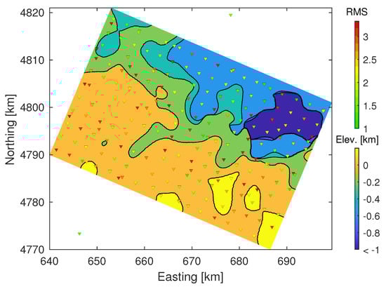 Depth of surface from 3D model projected on regional coordinates. Stations are marked as triangles with each face color corresponding to the station’s data achieved RMS misfit in the 1D joint inversion.