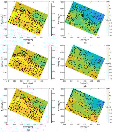 The independent model obtained from local earthquake tomography [26,27] and the presented results agree qualitatively well with the presence of lower velocity zones (see Figure 9). Note that LE tomography may overestimate the values at the nearer surface, i.e., above , which can be observed readily by the near indiscernible changes in that are not likely to be so constant (even with the present cell size of ). At this depth, LE tomography should be rather observed as the upper limit of the model’s because, for the very shallow layers, the only cells that are sampled with LET are those immediately below a station. In addition, those cells are sampled only by upgoing parallel rays, thus without ray crossing vertical smearing limits the resolution of LET at shallow depth. The much finer variations obtained from the joint inversion are more plausible and are consistently below the values of the LE tomography results. In fact, it might be advantageous to utilise the joint inversion results as initial (or fixed) near surface model for a refined LE tomography inversion in order to relieve this type of inversion from the need to find a near surface model without available data sensitivity to the model parameters. This could potentially improve inversion convergence, data misfit and model resolution. Another possible strategy could be to include HVSR and DC Joint inversion in the tomography inversion, which could result in improved confidence in the model results as shown above for the inclusion of HVSR to the inversion of DC data.