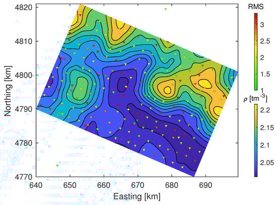 Large parts of the data set are relatively insensitive to density model variations as discussed above for the 1D joint inversion results. Nevertheless, at some depths and for some sites, density variation was necessary to achieve the best data fit. The low sensitivity of the density in our inversion prevents detailed interpretation of the results as low confidence in large parts of the results does not permit model slicing with sufficient confidence. We avoid this misrepresentation of confidence by only interpreting the mean density along depth columns of the model volume. The mean density is weighted by inverse depth to represent a decreasing effect of deep densities of equal size towards (hypothetical) gravity measurements and decreasing confidence with depth.