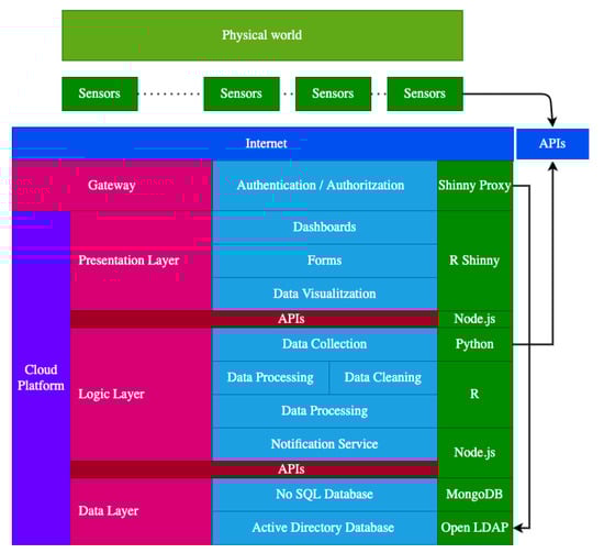 The main functionalities of this layer are gathering user input using forms and wizards, and displaying output data using dashboards and data visualization tools. This work proposes R Shiny to present the data collected by the sensors and the analysis provided by the cloud in a user-friendly manner. The data are obtained by the REST API offered by the Node js web service.