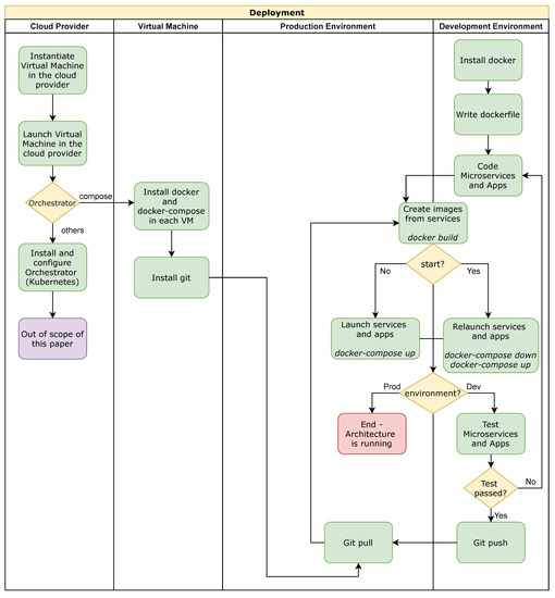 Figure 3 depicts a general-purpose deployment into a cloud provider (OpenNebula, Amazon Web Services or Google Cloud). First, it is configured the virtual resources into the cloud provider (CPU, Memory and Networks). Then, the operating system (Centos7 in our deployment) is installed to each virtual machine deployed together with all the required tools (Docker and Git). Next, an orchestrator is installed and configured. Our deployment uses docker-compose, but other alternatives that can be used are Kubernetes, docker-swarm, among others. In parallel, the development environment can be configured in a local machine to implement and test the services and the applications. Then, to integrate the development and production environments, GitHub is used (push and pull actions). Finally, the docker build commands are employed to create the images, and to run and execute all the services the docker-compose up commands are used.