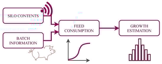 In a three-site system, pig production is divided in three stages: (a) maternity, where the piglets are born and stay there for 4–5 weeks; (b) rearing, where young pigs are grown up to the age of 8–10 weeks; and (c) fattening, where the pigs are grown for 17–20 weeks until they reach a target marketing weight and then are sent to the abattoir. In this application, our target is to estimate the growth at the fattening stage. Figure 4 shows the main steps of the data flow process, from the data acquisition to the final growth estimate. The data sources are the sensor measures and some technical parameters of the batch of pigs which are combined to provide an estimate of the average feed consumption per animal. The literature provides functions that relate the average consumption of pigs with the expected growth. The expected average weight is finally modeled as a weight distribution, so the farmer has a week by week estimation of the number of animals that are expected to be in each weight range.