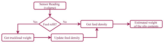 The information provided by the sensor is therefore a measure of volume which needs to be transformed to weight (see Figure 6). For doing so, we need to know the density of the feed which is different for each truckload that refills the silo. This characteristic demands to control for the points in which the reading increases due to the feed refilling operation. To reduce inaccuracies, it is expected that the farmer introduces the real weight of the added quantity. The system assumes a default density, and by comparing the estimation of the amount introduced according to the default value and the real value provided, a more precise estimation of the density can be done. The weight of the contents of the silo is estimated by multiplying the occupied volume of the silo times the density of the feed.