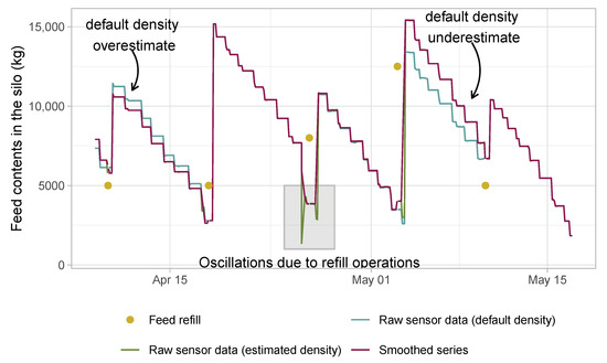 To approximate the amount of feed supplied to the batch would suffice to subtract two consecutive readings expressed as weight. However, the process of discharging the feed from the silo leaves the surface uneven making the readings fluctuate among consecutive periods (instead of being monotonically decreasing within any two refilling operations). Due to this reason, data cleaning is done by means of a centered moving average. Punctual missing data are also interpolated using this procedure. Figure 7 illustrates some of the data cleaning procedures that the application automatically performs. The dots show the days and the amount in which the silo was refilled. By default, the application assumes a feed density, but the density is re-estimated with the information about the real weight of the refilling load. Then, the series of the weight with the refilling-based density is computed and is cleaned in order to remove sensor noise or missing values.