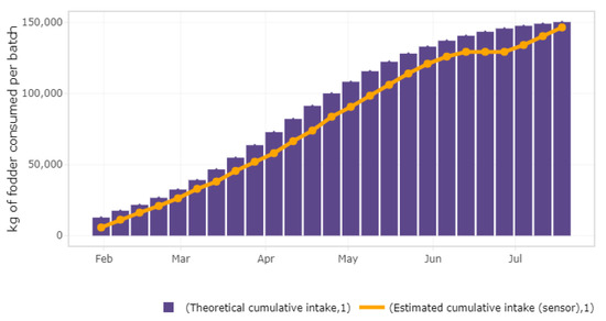 Once the point reading is cleaned, the accumulated weekly consumption is estimated (see Figure 8). This estimated consumption based on the sensor readings is compared with a theoretical accumulated feed consumption which is computed according to technical parameters that reflects usual patterns of the farm and the breed of animals that hosts. These parameters are provided by the user and are the average daily gain (), the expected feed conversion rate (), and the age (in weeks). Among the alternatives to estimate the expected accumulated feed intake () for a batch of N animals at week t [43], the exponential function is used: