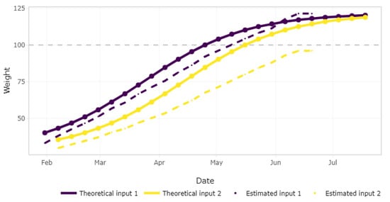 where is the average body weight (kg) at week t, A is the asymptotic adult body weight (kg), b is an empirically fitted parameter that makes the starting point flexible, k is an empirically fitted parameter related to the rate of growth, and is the average accumulated feed intake (kg) up to week t. Given that a batch may be composed by subgroups of animals, one for each entry, Equation (2) is applied to each subgroup. Figure 9 shows the expected weight for each entry of the batch at a specific point in time, computed with the average feed intake according to the theoretical function and also with the estimated data from the sensor. This information has commercial significance, as deviations between those curves alert the farmer to review the animals in order to find the cause of the deviance. However, before diving into the causes, data accuracy has to be verified. When a significant deviation between the theoretical and sensor-based estimations is detected, an alert message is sent to the farmer to verify that the data corresponding to the weight of the silo’s refilling information have been provided.