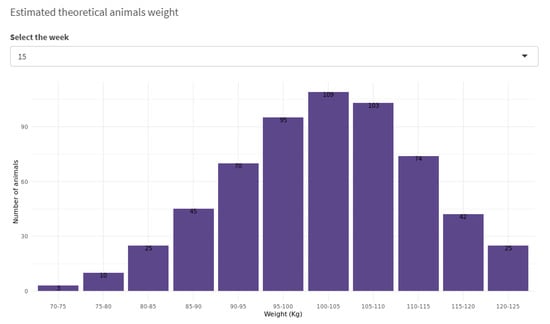 The distribution of the weight at a particular point in time is represented by a Normal distribution with the mean according to Equation (2) and variance computed from a cubic polynomial function. To provide a better picture of the weight of the animals in the batch, all the subgroups distributions are merged to compose the final weight distribution. Figure 10 shows the weight distribution at a particular week with the expected number of animals within a 5 kg range. This information is especially relevant to plan the delivery of animals to the abattoir based on a target weight.