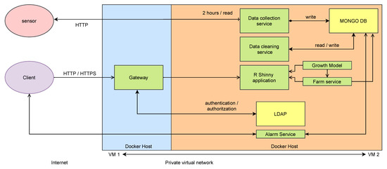 Figure 11 shows the deployment of the architecture explained in Section 4 applied to the case study. This proof of concept is deployed using two virtual machines (VM1 and VM2) under OpenNebula cloud provider. VM1 contains the gateway and is the open-door to the internet. VM2 is only accessible from VM1. As we commented, we use Centos7 as operating system in both virtual machines. This figure also highlights all the services that are started using Docker compose orchestrator (green and yellow boxes). The yellow boxes represent the services related to the data layer, and the green ones represent the APIs, scripts, and other services discussed. Note that the data collection service is gathering data from the sensor every to 2 h and stores it into the database using HTTP communication protocol. Next, the data cleaning service processes incoming data and checks for errors and non-consistent data. In parallel, the alarm service checks information from the database to inform the user, if needed. Finally, the RShinny Application uses farm service (API) and the growth model to interact using HTTP and HTTPS communication protocols to display information to the final user (client). This communication is controlled (authenticated and authorized) through the gateway.