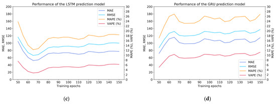 As shown in Figure 6, the prediction performance of various deep neural network models (ISTL-LSTM, STL-LSTM, LSTM, GRU) can be compared. The results indicate that when the hyperparameter ‘epochs’ was equal to 65, 100, 65, or 50, respectively, the performance of the corresponding model could be most optimal.