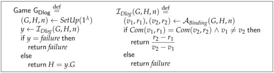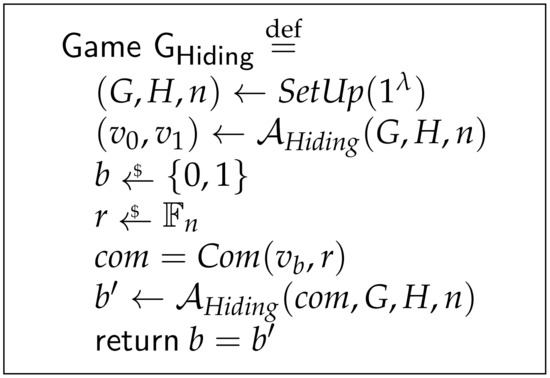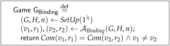 - Metere, R.; Dong, C. Automated Cryptographic Analysis of the Pedersen Commitment Scheme. In Proceedings of the Computer Network Security-7th International Conference on Mathematical Methods, Models, and Architectures for Computer Network Security, MMM-ACNS 2017, Warsaw, Poland, 28–30 August 2017; Rak, J., Bay, J., Kotenko, I.V., Popyack, L.J., Skormin, V.A., Szczypiorski, K., Eds.; Lecture Notes in Computer Science. Springer: Berlin/Heidelberg, Germany, 2017; Volume 10446, pp. 275–287. [Google Scholar] [CrossRef] [Green Version]