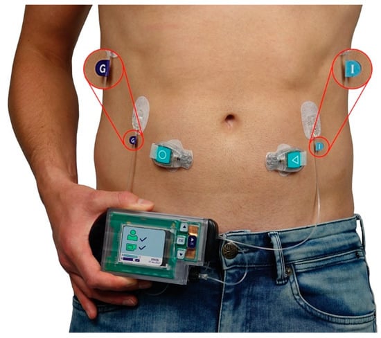 Representation of the AP™ as it generally is worn by T1DM patients. Here, the mainframe, as shown in the subject’s right hand, at least consists of the main processor, regulatory hormones, and an accelerometer. Furthermore, the transmitters, depicted by the devices with a circle and triangle, contain the blood glucose sensors and accelerometers. Finally, the cannulas (purple G and blue I) serve as an injection spot for the regulatory hormones [].